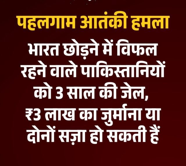 न्यूज डेस्क नई दिल्ली: (PTI): सरकार द्वारा तय डेडलाइन तक भारत नहीं छोड़ने वाले पाकिस्तानी नागरिकों पर कड़ी कार्रवाई होगी. जम्मू-कश्मीर के पहलगाम में 22 अप्रैल को पाकिस्तान समर्थित आतंकियों के हमले के बाद यह सख्त कदम उठाया गया है. नए कानून के तहत, वीजा अवधि खत्म होने के बाद रुकने पर 3 साल तक की जेल या 3 लाख रुपये तक का जुर्माना या दोनों सजा का प्रावधान है. गृह मंत्री अमित शाह ने सभी राज्यों को निर्देश दिए हैं कि कोई भी पाकिस्तानी नागरिक तय समय सीमा के बाद भारत में न रुके.