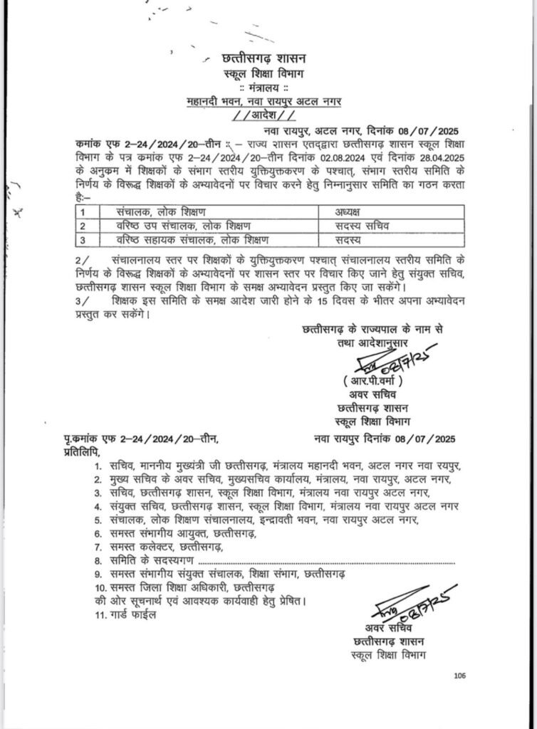 रायपुर: छत्तीसगढ़ सरकार ने शिक्षकों के युक्तियुक्तकरण (Rationalization) प्रक्रिया को अधिक पारदर्शी और उत्तरदायी बनाने की दिशा में महत्वपूर्ण कदम उठाया है। शासन ने संभाग और संचालनालय स्तर पर लिए गए निर्णयों के विरुद्ध शिक्षकों की आपत्तियों पर सुनवाई के लिए दो स्तरीय समितियों का गठन किया है। ये समितियां संभाग और संचालनालय स्तर पर काम करेंगी।शिक्षक अपनी आपत्तियों को पहले संभागीय स्तर पर और आवश्यक होने पर संचालनालय स्तर पर प्रस्तुत कर सकेंगे। इसके लिए 15 दिनों की समयसीमा निर्धारित की गई है।बता दें कि राज्य सरकार द्वारा गठित संभागीय समिति की अध्यक्षता संबंधित संभागायुक्त (Divisional Commissioner) करेंगे। समिति में संयुक्त संचालक (JD) और डीपीआई कार्यालय के सहायक संचालक को सदस्य नामित किया गया है। यह समिति जिला स्तरीय समिति के निर्णयों के विरुद्ध प्रस्तुत अभ्यावेदनों पर सुनवाई करेगी और स्वतंत्र निर्णय दे सकेगी।संचालनालय स्तर पर दूसरी समितियदि कोई शिक्षक संभागीय समिति के निर्णय से असंतुष्ट रहता है, तो वह अंतिम अपील के रूप में संचालनालय स्तरीय समिति के समक्ष अपनी आपत्ति दर्ज कर सकेगा। इस समिति की अध्यक्षता संयुक्त सचिव, स्कूल शिक्षा विभाग करेंगे और इसमें अन्य वरिष्ठ अधिकारी सदस्य होंगे। यह समिति राज्य स्तर पर अभ्यावेदनों के अंतिम निपटारे हेतु कार्य करेगी।देखें आदेश –गौरतलब है कि सरकार के इस फैसले के बाद ऐसे शिक्षकों को राहत मिलने की उम्मीद है, जिन्हें जिला शिक्षा अधिकारियों (DEO) एवं विकासखंड शिक्षा अधिकारियों (BEO) द्वारा गलत तरीके से अतिशेष घोषित कर अन्य विद्यालयों में स्थानांतरित कर दिया गया था।
