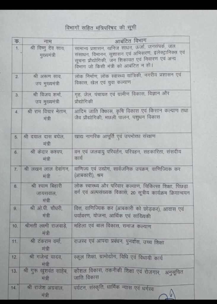 रायपुर छत्तीसगढ़: CG में मंत्रियों के विभागों का हुआ बंटवारा विष्णु देव साय, मुख्यमंत्री सामान्य प्रशासन, खनिज साधन, ऊर्जा, जनसंपर्क, जल संसाधन, विमानन, सुशासन एवं अभिसरण, इलेक्ट्रॉनिक्स एवं सूचना प्रौद्योगिकी, जन शिकायत एवं निवारण एवं अन्य अप्रत्याशित विभाग।