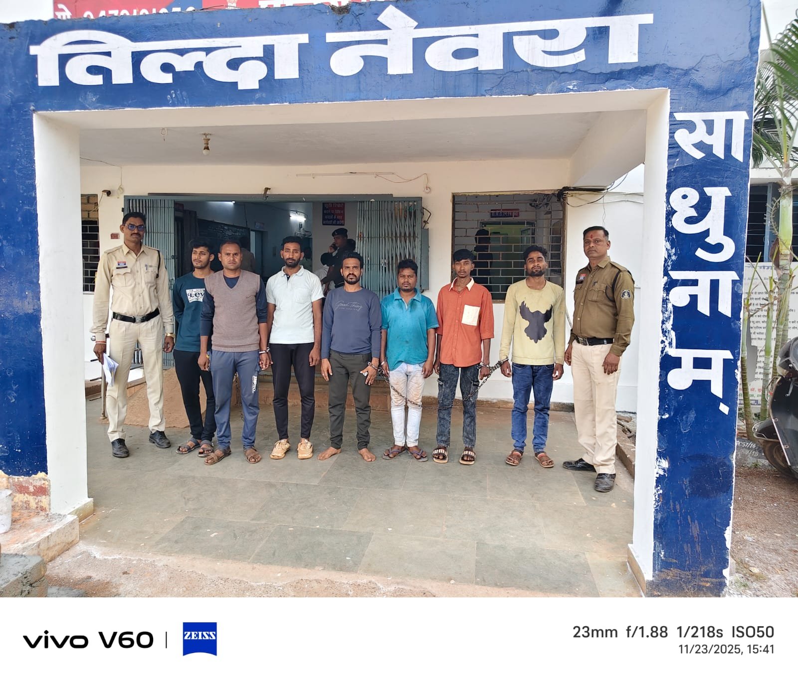 नाम पता असामाजिक तत्व -1. संतोष नेताम पिता स्व मनहरण नेताम उम्र 27 वर्ष ग्राम सासाहोली, थाना तिल्दा नेवरा, जिला रायपुर2. प्रहलाद वर्मा पिता स्वर्गीय रामकुमार वर्मा उम्र 36 वर्ष ग्राम छतौद थाना तिल्दा नेवरा, जिला रायपुर3. गौरव वर्मा पिता रामकुमार वर्मा उम्र 25 वर्ष ग्राम छतौद थाना तिल्दा नेवरा जिला रायपुर 4. सत्य प्रकाश यदु पिता सुरेश यदु 31 वर्ष ग्राम कुंदरु थाना तिल्दा नेवरा जिला रायपुर5. लेखू राम यदु पिता जगेश्वर प्रसाद यदु उम्र 30 वर्ष ग्राम तुलसी थाना तिल्दा नेवरा जिला रायपुर 6. गिरीश कुमार ध्रुव पिता स्व पुणिराम ध्रुव उम्र 31 वर्ष वार्ड क्रमांक 11 नेवरा थाना तिल्दा नेवरा जिला रायपुर रायपुर।