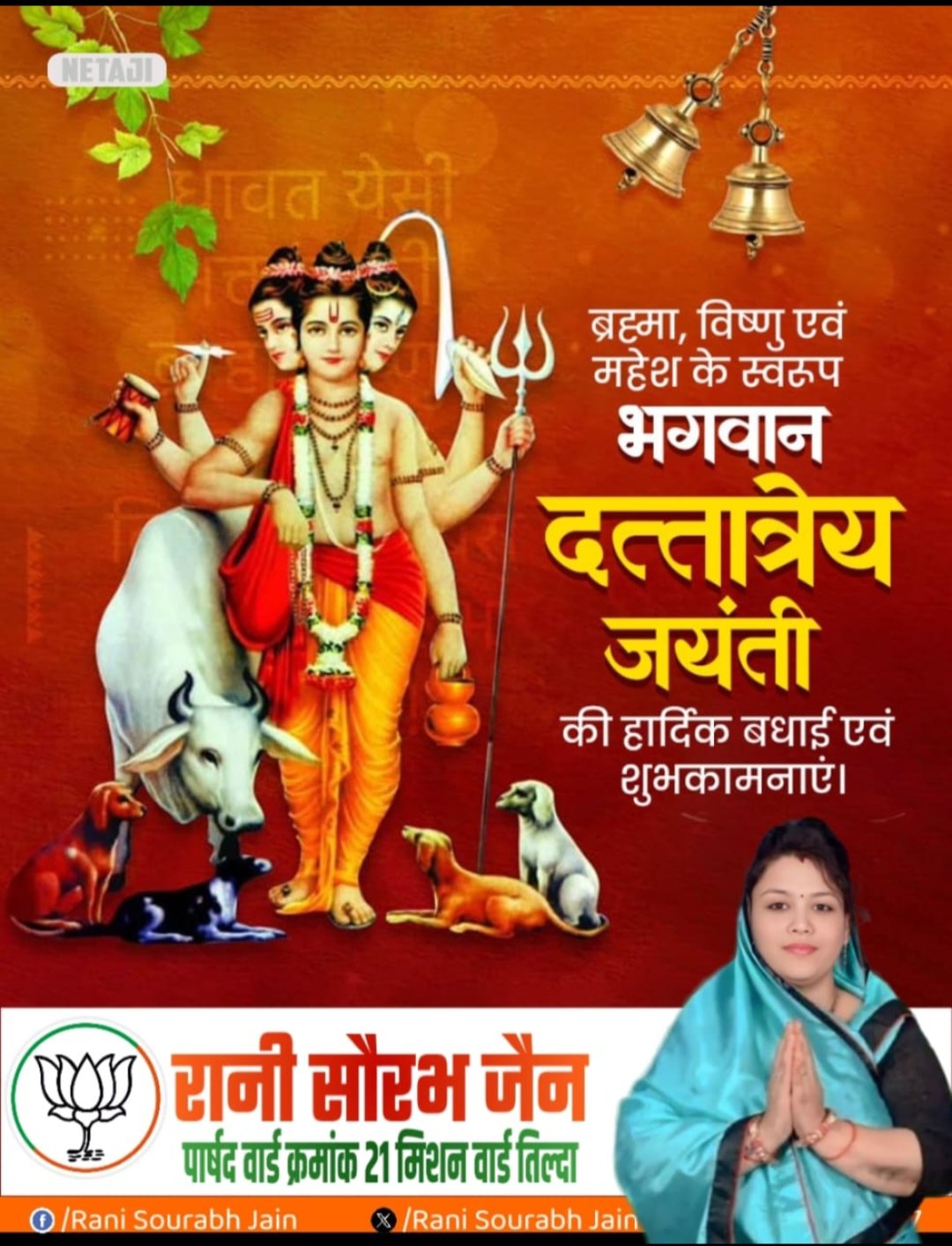 तिल्दा नेवरा: भाजपा समर्पित समाज सेविका पार्षद नगर पालिका तिल्दा नेवरा श्रीमती रानी सौरभ जैन ने भगवान दत्तात्रेय की जयंती (4 दिसम्बर) के पावन अवसर पर प्रदेशवासियों को हार्दिक बधाई और शुभकामनाएँ दी हैं। उन्होंने भगवान दत्तात्रेय से समस्त नागरिकों के सुख, शांति, समृद्धि और कल्याण की कामना की है।समाज सेविका पार्षद श्रीमती रानी सौरभ जैन ने कहा कि भगवान दत्तात्रेय सत्कर्म, सादगी, विनम्रता, त्याग और ज्ञान के शाश्वत प्रतीक हैं। उन्होंने मानव जीवन को अहंकार से मुक्त होकर ज्ञानमार्ग अपनाने और जीवन को सद्कर्मों से आलोकित करने की प्रेरणा दी है।श्रीमती रानी सौरभ जैन ने कहा कि भगवान दत्तात्रेय ब्रह्मा, विष्णु और महेश — तीनों देवताओं के संयुक्त दिव्य स्वरूप हैं। उनकी उपासना से ज्ञान, शक्ति, धैर्य और समृद्धि का आशीर्वाद प्राप्त होता है। उन्होंने कहा कि भगवान दत्तात्रेय जयंती हम सबके लिए आत्मचिंतन, सद्विचार और संस्कारों से भरे जीवन की प्रेरणा लेकर आती है।श्रीमती रानी सौरभ जैन ने प्रदेशवासियों से आग्रह किया कि वे भगवान दत्तात्रेय के उपदेशों को आत्मसात कर समाज में सद्भाव, सेवा और सकारात्मकता को बढ़ाने का संकल्प लें।