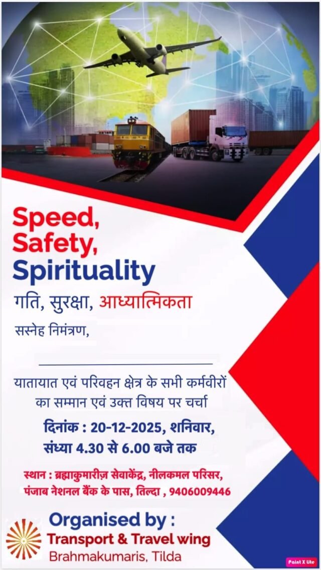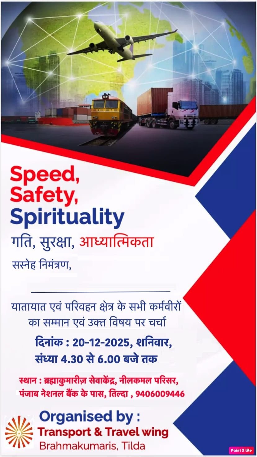 तिल्दा नेवरा : यातायात एवं परिवहन क्षेत्र में कार्यरत पेशेवरों, व्यवसायियों और सेवा में जुटे कर्मवीरों के लिए एक अत्यंत प्रभावशाली, प्रेरणादायी एवं जनहितकारी कार्यक्रम का आयोजन ब्रह्माकुमारीज़ सेवा केंद्र, तिल्दा द्वारा किया जा रहा है। यह विशेष कार्यक्रम 20 दिसंबर 2025 (शुक्रवार) को शाम 4.30 बजे से ब्रह्माकुमारीज़ सेवा केंद्र, तिल्दा (पीएनबी एवं एचडीएफसी बैंक के पास, खरोरा रोड, तिल्दा) में संपन्न होगा।कार्यक्रम का मुख्य विषय “स्पीड, सेफ्टी, स्पिरिचुएलिटी – गति, सुरक्षा और आध्यात्मिकता” रहेगा, जिसमें यह स्पष्ट किया जाएगा कि आधुनिक तेज़ रफ्तार जीवन और कार्यशैली के बीच मानसिक संतुलन, शांति और आध्यात्मिक चेतना किस प्रकार सड़क, रेल और अन्य परिवहन माध्यमों में होने वाली त्रुटियों, अव्यवस्थाओं और दुर्घटनाओं को कम करने में सहायक बन सकती है।इस अवसर पर सड़क परिवहन, रेल्वे, सार्वजनिक एवं निजी यातायात सेवाओं से जुड़े ड्राइवर, कंडक्टर, पायलट, लोको पायलट, ट्रांसपोर्ट व्यवसायी, ट्रैवल एजेंसियों के संचालक सहित इस क्षेत्र में सेवाएं दे रहे सभी कर्मवीरों का ब्रह्माकुमारीज़ द्वारा सम्मान किया जाएगा। यह सम्मान उनके निःस्वार्थ सेवा भाव, अनुशासन, साहस और समाज को सुरक्षित गंतव्य तक पहुंचाने में दिए गए अतुलनीय योगदान के लिए प्रदान किया जाएगा।कार्यक्रम में विशेष रूप से यह बताया जाएगा कि राजयोग ध्यान द्वारा शांत मन कैसे निर्णय क्षमता को बढ़ाता है, एकाग्रता को मजबूत करता है और तनाव, क्रोध व जल्दबाज़ी जैसी प्रवृत्तियों पर नियंत्रण लाकर दुर्घटनाओं की संभावनाओं को कम करता है। परिवहन क्षेत्र की व्यस्त और चुनौतीपूर्ण दिनचर्या को ध्यान में रखते हुए प्रतिभागियों को लाइव, एक मिनट की सरल एवं प्रभावी ध्यान तकनीकें भी सिखाई जाएंगी, जिन्हें वे कार्य के दौरान या यात्रा से पूर्व आसानी से अपनाकर अपने मन को स्थिर और सकारात्मक बना सकते हैं।ब्रह्माकुमारीज़ तिल्दा केंद्र द्वारा यह कार्यक्रम समाज में यह संदेश देने का प्रयास है कि केवल तकनीक और नियम ही नहीं, बल्कि आध्यात्मिक जागरूकता और मानसिक शांति भी सुरक्षित यातायात की मजबूत आधारशिला हैं। आयोजकों ने सभी परिवहन एवं यात्रा क्षेत्र से जुड़े कर्मवीरों, व्यवसायियों एवं नागरिकों से इस कार्यक्रम में अधिक से अधिक संख्या में उपस्थित होकर लाभ लेने की अपील की है।