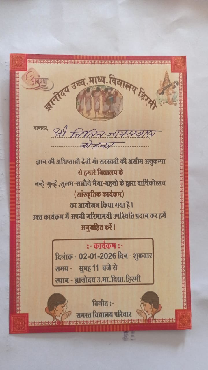 हिरमी – रावन: ज्ञानोदय उच्च माध्यमिक विद्यालय, हिरमी में आगामी 02 जनवरी 2026 (शुक्रवार) को वार्षिक सांस्कृतिक महोत्सव का भव्य आयोजन किया जा रहा है। विद्यालय परिसर में आयोजित होने वाले इस कार्यक्रम की तैयारियाँ जोरों पर हैं। विद्यालय प्रबंधन ने बताया कि कार्यक्रम का शुभारंभ सुबह 11:00 बजे से होगा। विद्या की अधिष्ठात्री देवी माँ सरस्वती की वंदना के साथ शुरू होने वाले इस समारोह में विद्यालय के नन्हे-मुन्ने और सुलभ-सलौने छात्र-छात्राओं द्वारा विभिन्न रंगारंग सांस्कृतिक प्रस्तुतियाँ दी जाएंगी। छात्र-छात्राओं द्वारा लोक नृत्य, नाटक और गीतों की प्रस्तुति। गरिमामयी उपस्थिति: क्षेत्र के प्रबुद्ध जनों और अभिभावकों की उपस्थिति में बच्चों का उत्साहवर्धन किया जाएगा। समय व स्थान: कार्यक्रम शुक्रवार सुबह 11 बजे से विद्यालय प्रांगण, हिरमी में शुरू होगा। समस्त विद्यालय परिवार ने क्षेत्रवासियों और अभिभावकों से अपील की है कि वे इस अवसर पर अपनी गरिमामयी उपस्थिति प्रदान कर बच्चों का मनोबल बढ़ाएं और कार्यक्रम को सफल बनाएं। वार्षिकोत्सव 2026 ज्ञानोदय उच्च माध्यमिक विद्यालय, हिरमी के नन्हे सितारों की कला और प्रतिभा देखने जरूर पधारें! दिनांक: 02-01-2026 (शुक्रवार) समय: सुबह 11:00 बजे से स्थान: विद्यालय परिसर, हिरमीआप सभी सादर आमंत्रित हैं।~ विनीत: समस्त विद्यालय परिवार, हिरमी