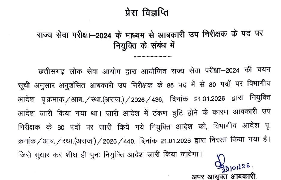 रायपुर : राज्य सेवा परीक्षा-2024 के माध्यम से आबकारी उप निरीक्षक के 80 पदों पर जारी नियुक्ति आदेश को तकनीकी (टंकण) त्रुटि के कारण रद्द कर दिया गया है।छत्तीसगढ़ लोक सेवा आयोग की चयन सूची के आधार पर 85 में से 80 पदों पर 21 जनवरी 2026 को नियुक्ति आदेश जारी हुआ था। लेकिन आदेश में गलती पाए जाने पर उसी दिन नया आदेश जारी कर पुराने आदेश को निरस्त कर दिया गया। विभाग ने स्पष्ट किया है कि त्रुटि में सुधार कर जल्द ही पुनः नया नियुक्ति आदेश जारी किया जाएगा।