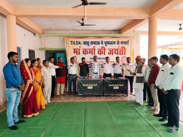 तिल्दा नेवरा: सोमनाथ धाम कर्मा मंदिर प्रांगण में रविवार को साहू समाज की आराध्य देवी की 1010 वीं जयंती मनाई गई जिसमें सर्वप्रथम मां कर्मा की पूजा अर्चना करने के बाद पहुंचे अतिथियों का स्वागत वंदन कर बच्चों के द्वारा मनमोहक प्रस्तुति दिया गया। अतिथि के रूप में तहसील साहू संघ के संरक्षक पोषण साहू , उपाध्यक्ष गिरेंद्र साहू , परिक्षेत्र अध्यक्ष संतोष साहू , डागेश्वर साहू,पवन साहू , मनोहर साहू,मंदिर समिति परम संरक्षक तुला राम साहू उपस्थित रहे। अतिथियों ने अपने उद्बोधन में सामाजिक एकता जोड़ दिया।इस अवसर पर मंदिर समिति के संरक्षक भरत साहू , अध्यक्ष माखन साहू, उपाध्यक्ष रूपकुमार साहू, सचिव डॉ तखत साहू ,सह सचिव परमेश्वर साहू , कोषाध्यक्ष बेनी राम साहू , अंकेक्षक रामेश्वर साहू, डॉक्टर शिव कुमार साहू तखत राम साहू ,रंजीत साहू,अरुण साहू युगल किशोर साहू, सोनम साहू, रतनी साहू, दुष्यंत साहू,मुकेश साहू , परमेश्वर साहू ,सहित भारी संख्या में सामाजिक जन उपस्थित रहे।