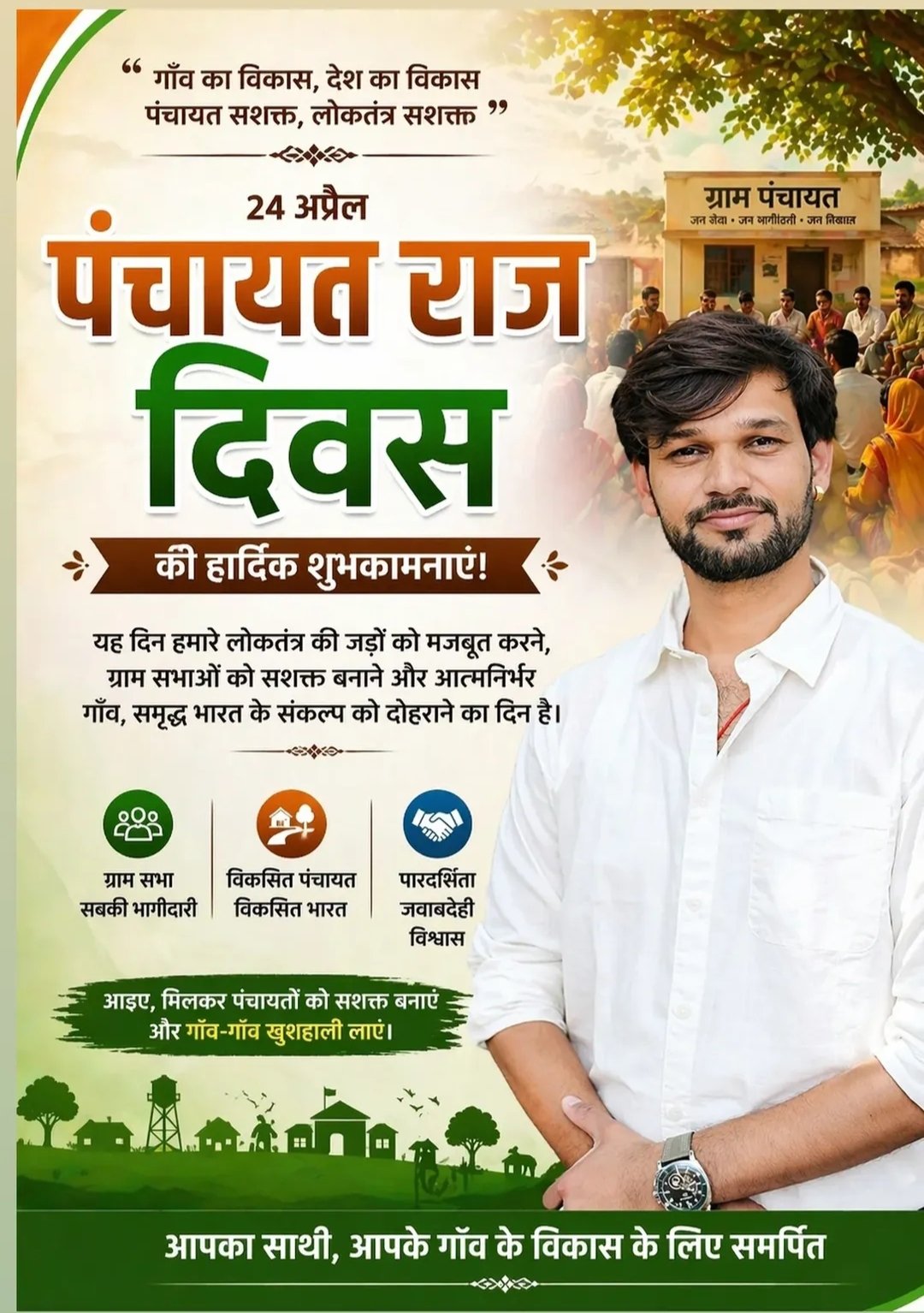 तिल्दा नेवरा :राष्ट्रीय पंचायती राज दिवस के पावन अवसर पर, युवा नेता जनपद सदस्य और ग्रामीण विकास के साथी देवव्रत शर्मा ने समस्त क्षेत्रवासियों को हार्दिक बधाई और शुभकामनाएँ दी हैं। इस ऐतिहासिक दिन पर उन्होंने लोकतंत्र की जड़ों को मजबूत करने और ग्राम सभाओं को सशक्त बनाने का आह्वान किया। विकसित भारत की ओर कदम देवव्रत शर्मा ने इस अवसर पर कहा कि “गाँव का विकास ही देश का असली विकास है।” उन्होंने स्पष्ट किया कि जब हमारी पंचायतें सशक्त होंगी, तभी हमारा लोकतंत्र वास्तव में मजबूत होगा। उनका विजन ‘विकसित पंचायत से विकसित भारत’ के संकल्प को दोहराना है, जहाँ हर गाँव आत्मनिर्भर और समृद्ध हो। उल्लेखनीय है कि प्रतिवर्ष 24 अप्रैल को राष्ट्रीय पंचायती राज दिवस मनाया जाता है, जो 1993 में हुए 73वें संविधान संशोधन के माध्यम से पंचायती राज व्यवस्था को संवैधानिक दर्जा मिलने का प्रतीक है। इस अवसर पर छत्तीसगढ़ के विभिन्न जिलों में विशेष ग्राम सभाओं का आयोजन भी किया जा रहा है। जनपद सदस्य देवव्रत शर्मा ने अंत में सभी ग्रामीणों से मिलकर पंचायतों को सशक्त बनाने की अपील की ताकि हर घर तक खुशहाली पहुँचाई जा सके।